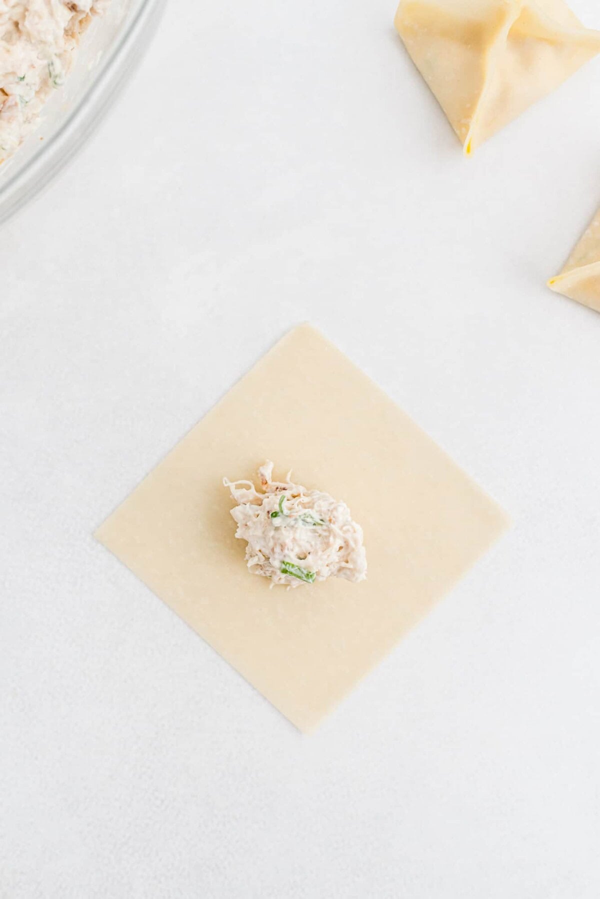 Fill the wonton wrappers. Put a rounded teaspoon of filling in the center of a wrapper. Try not to get carried away and put too much filling in because that makes it more difficult to fold and seal the wonton wrappers.