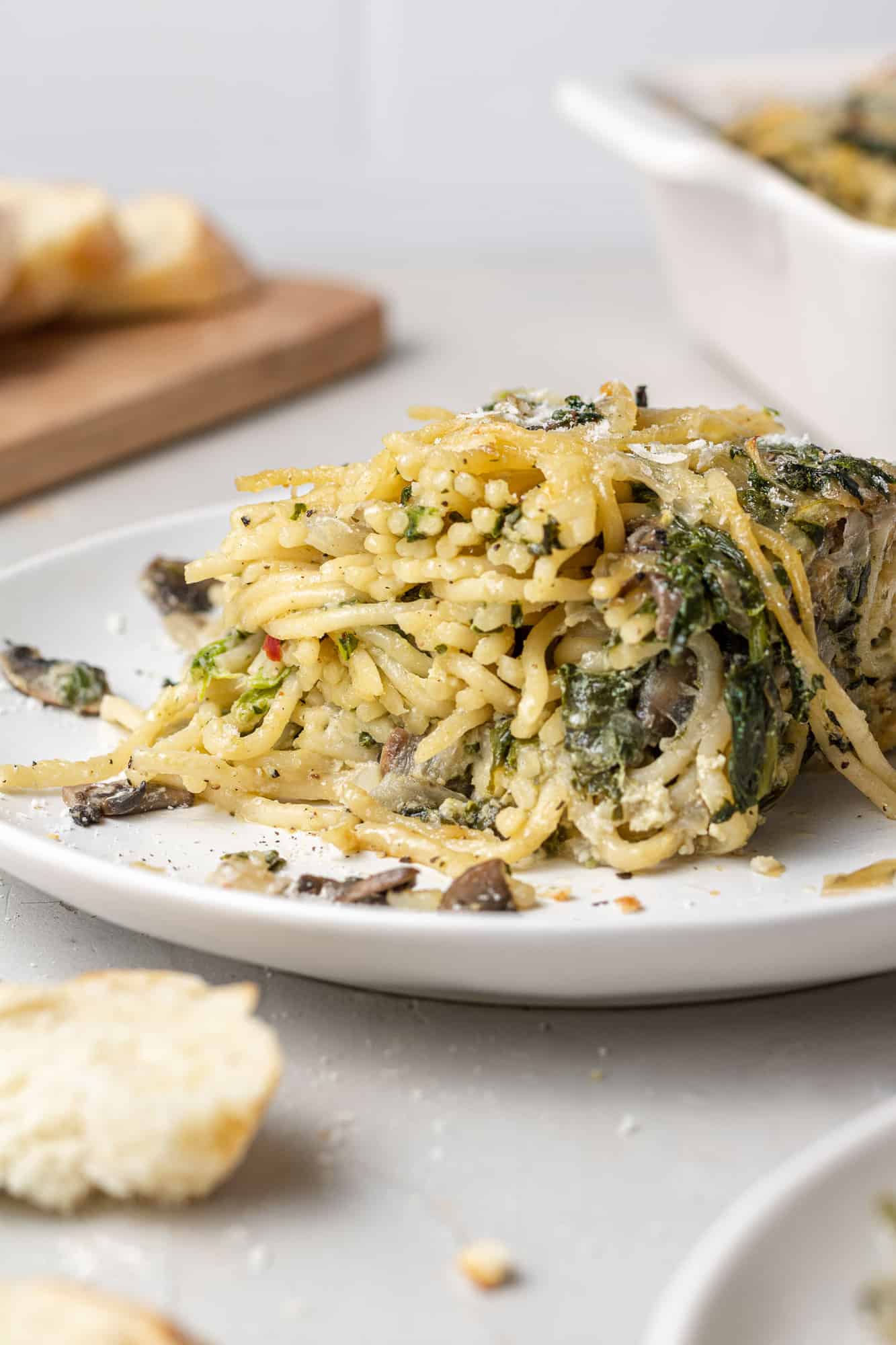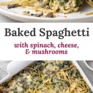 I just love this pasta bake! Baked spaghetti was always (and still is!) one of my favorite meals. My mom wisely made extra spaghetti when she cooked up a batch of homemade spaghetti sauce and saved the excess pasta to make this cheesy delight with a Florentine twist. I have to confess that I liked this better.