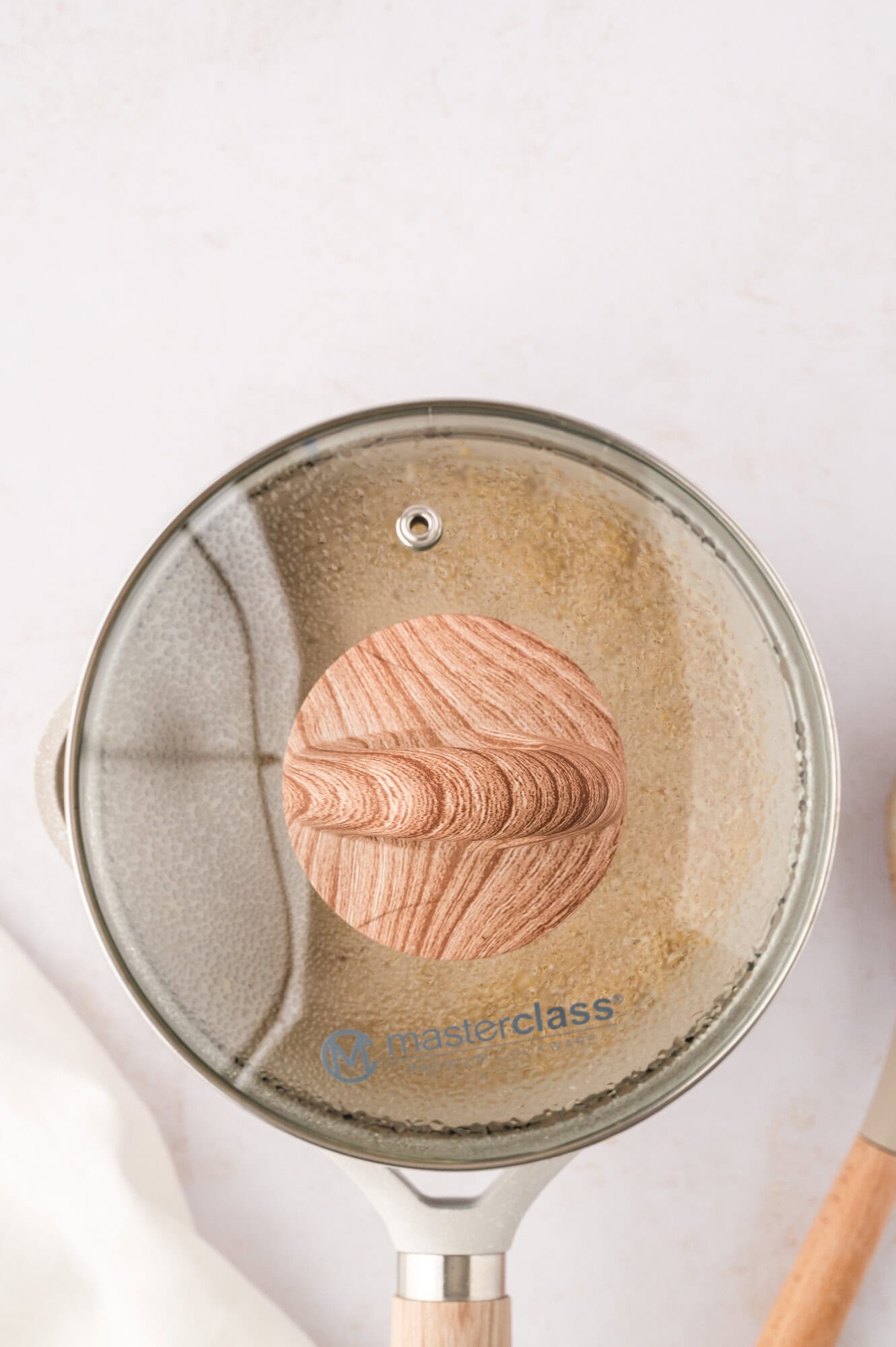 Heat liquids. Bring the milk, water, and salt to a simmer in a saucepan (that has a cover) over medium high heat.
