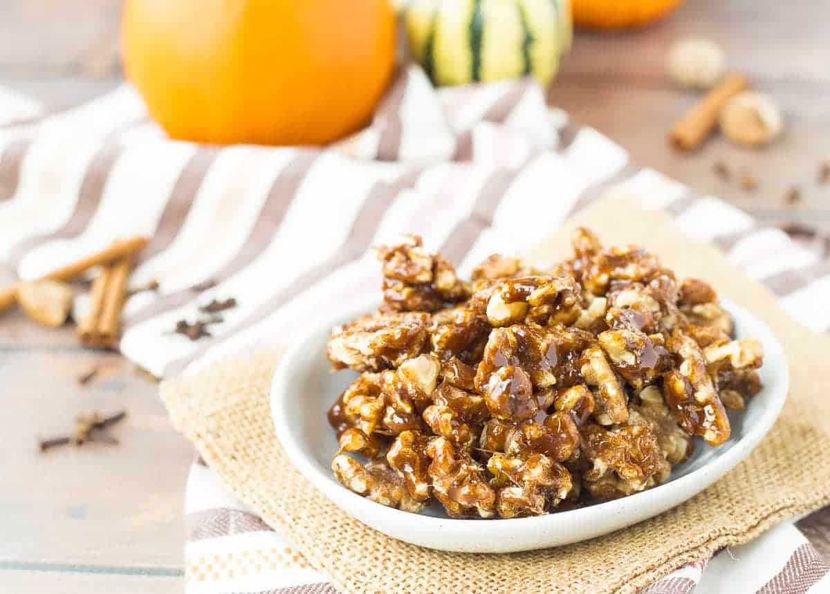 As a snack. Crunchy pumpkin spice candied walnuts are a festive snack to serve as an appetizer at Thanksgiving or Christmas. Or, add them to your charcuterie boards or an after-school snack board all season long (like we do, any chance we get).