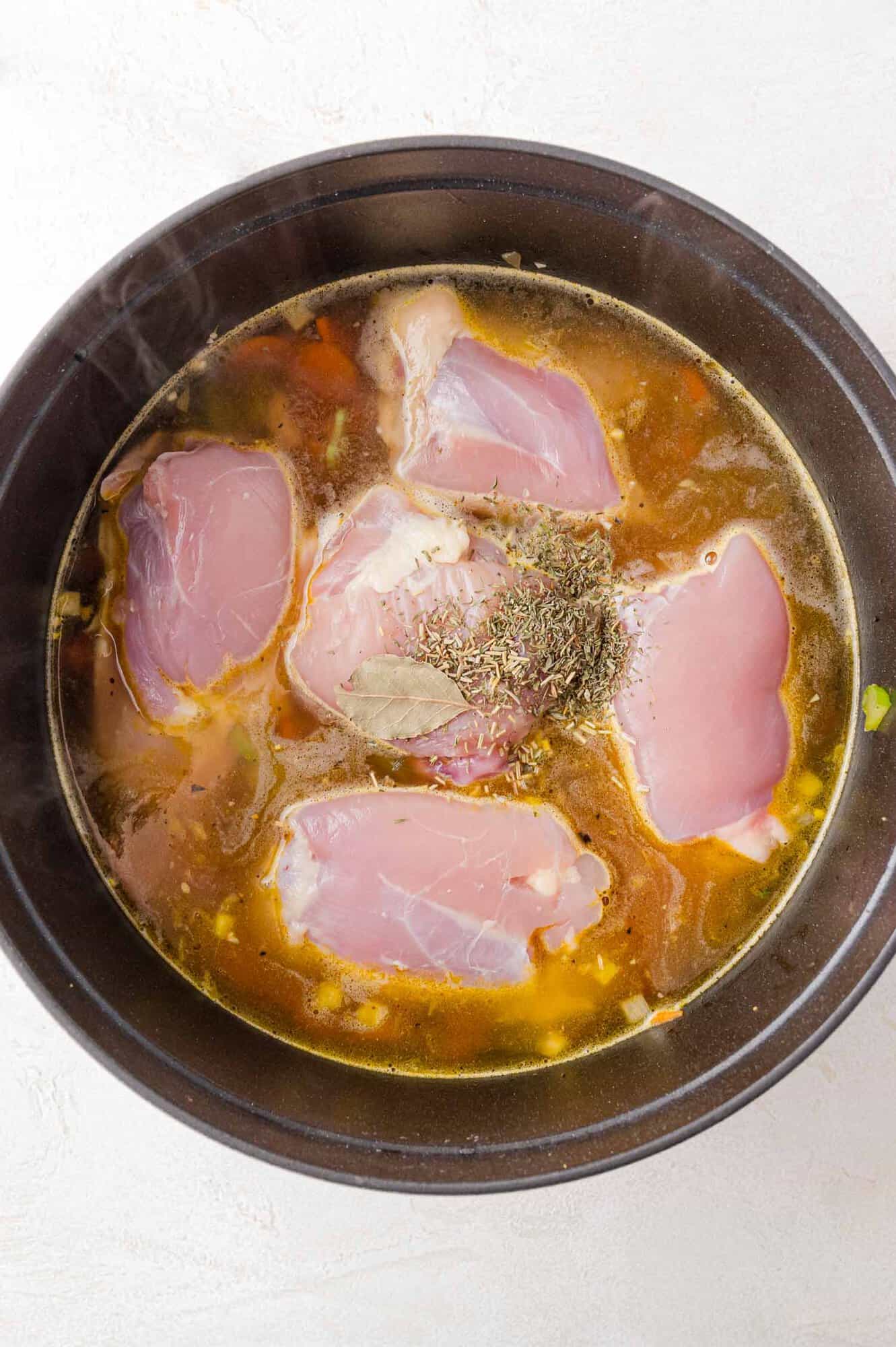 3 cups low sodium chicken broth, 2 pounds boneless skinless chicken thighs, ½ teaspoon dried thyme, 1 bay leaf, ¼ teaspoon crushed rosemary