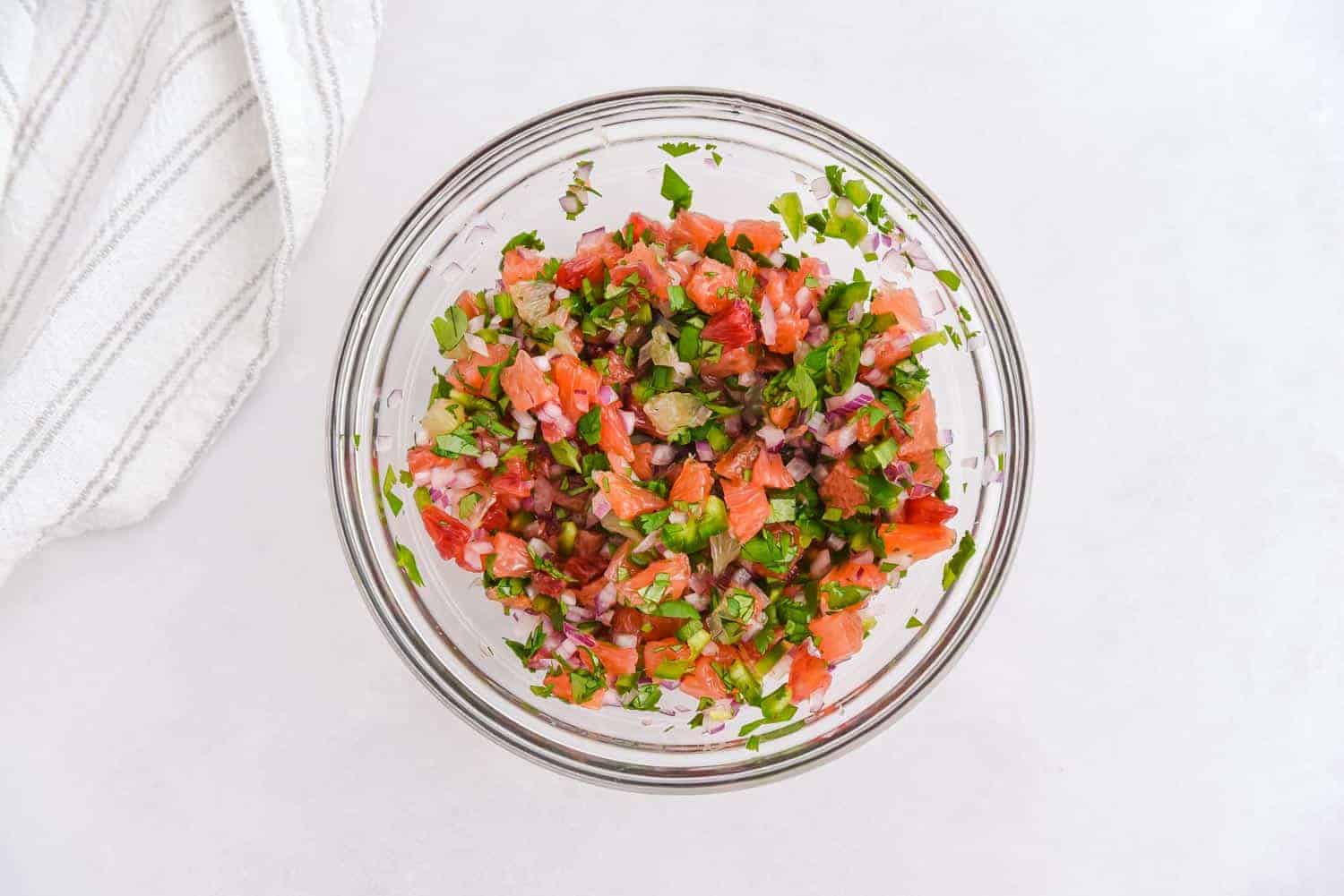 - Combine chopped grapefruit, orange, and lime segments. You should have about 2 cups of segmented fruit. Lightly stir in red onion, jalapeño, cilantro, and salt until ingredients are combined.