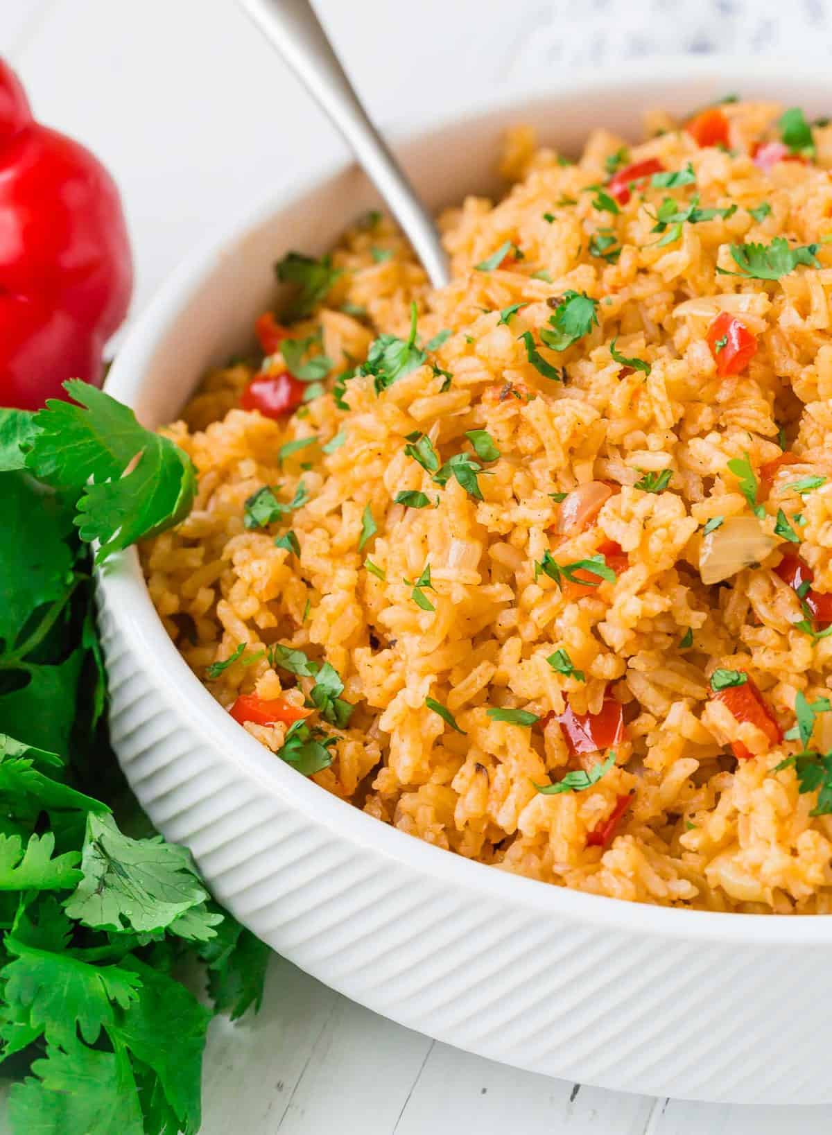 Don’t settle for plain white rice! Mexican rice is perfect alongside tequila lime grilled chicken, fajita stuffed chicken, southwest-style mini meatloaves, barbecued ribs, or crispy air fryer salmon. Mexican rice goes great with any of your southwest favorites: tacos, enchiladas, fajitas, nachos, refried beans, and more.