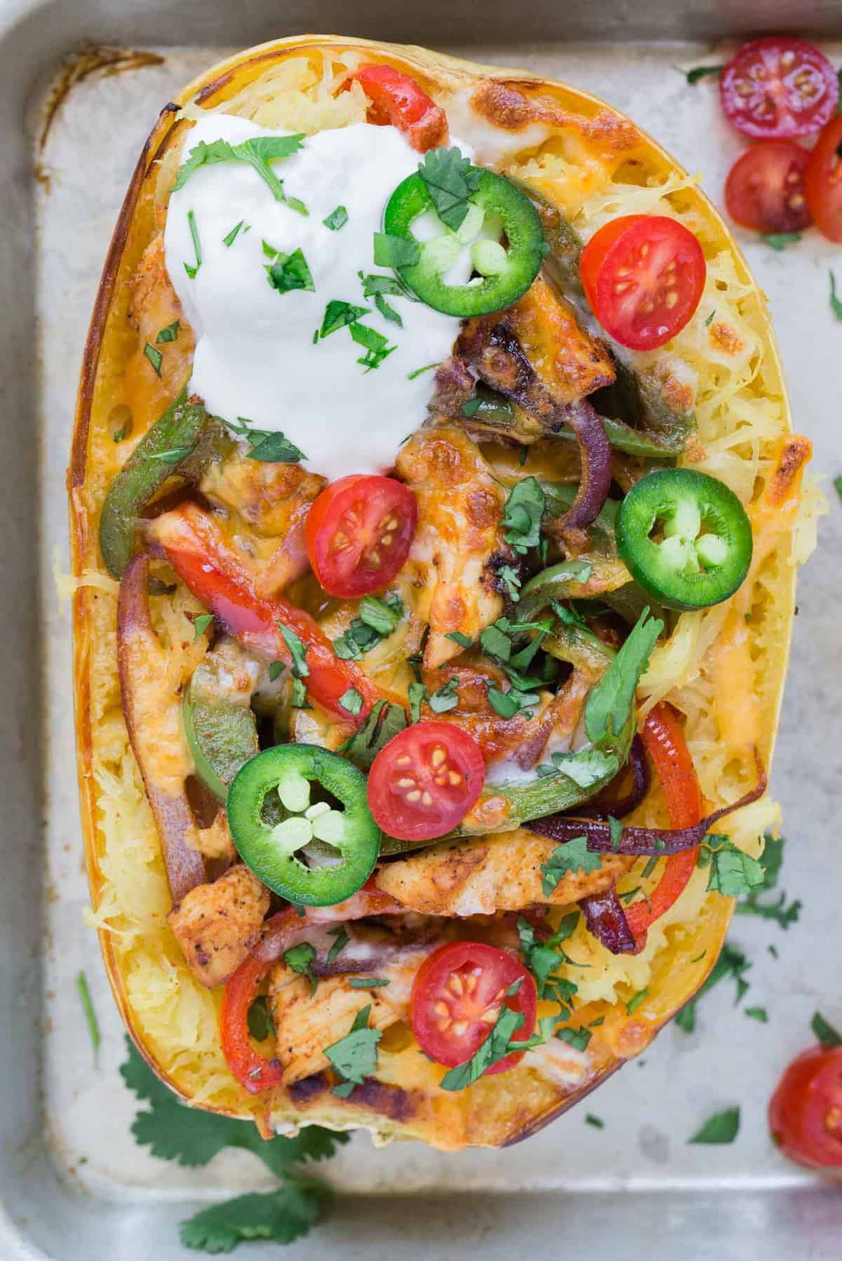 Lots of ways to customize. Like any fajita, it’s easy to prepare each spaghetti squash half just the way each person likes it. If you have someone in your family that’s a vegetarian, they can skip the chicken. Another person may need to omit the cheese. My dad doesn’t like peppers, so I make one squash half without. You can be creative with fresh toppings that are added, too. Keep reading for topping ideas.