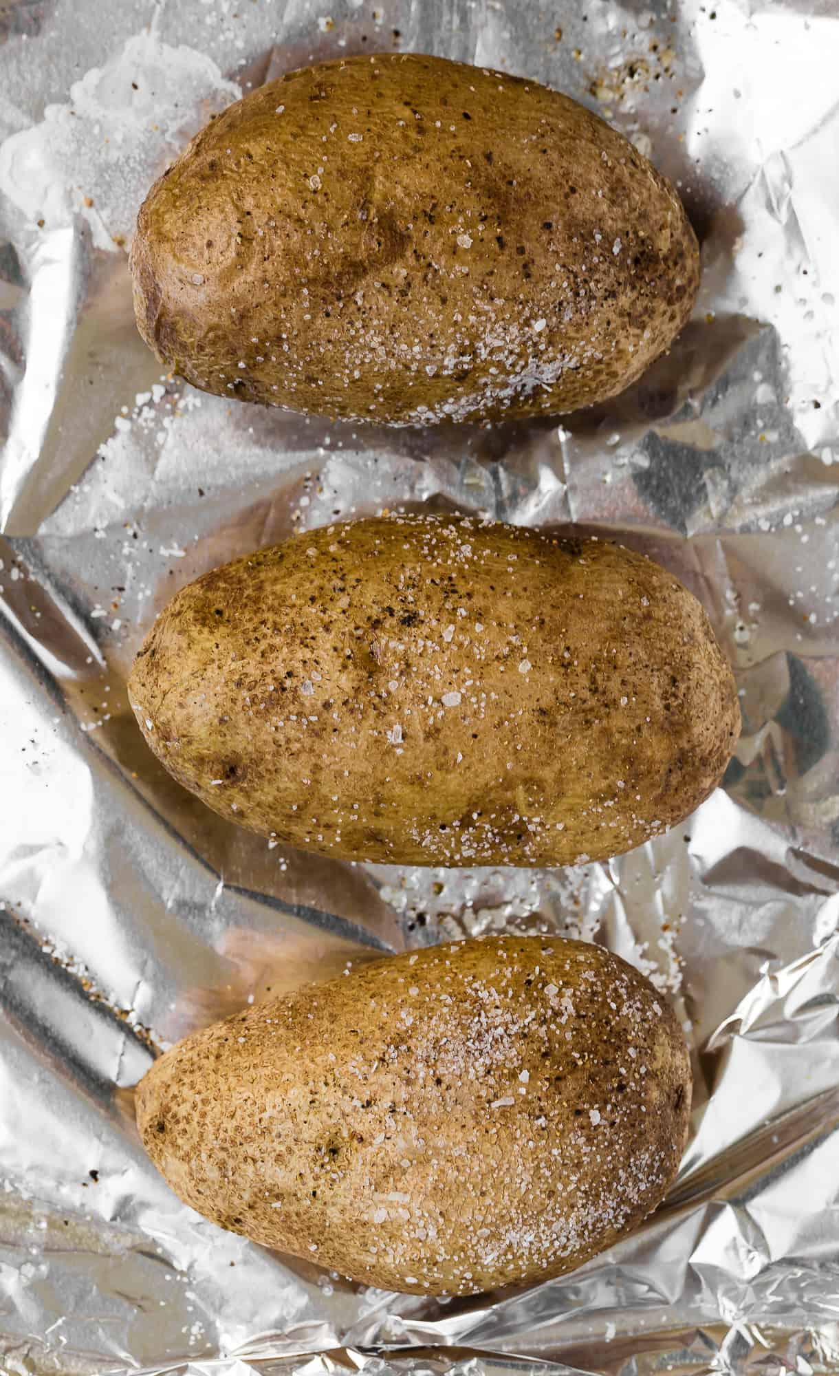 Foil or no foil. Should you wrap the potatoes or not? It depends on how you like the skin. I love the salty crispy brown skin of a baked potato–it’s the best part! Potatoes wrapped in foil will have soft skins because they steam as they bake.