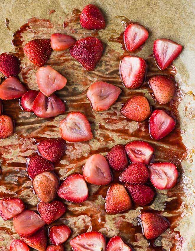 - Meanwhile, prepare roasted strawberries. Preheat oven to 350ºF. LIne a large rimmed baking sheet with parchment paper.