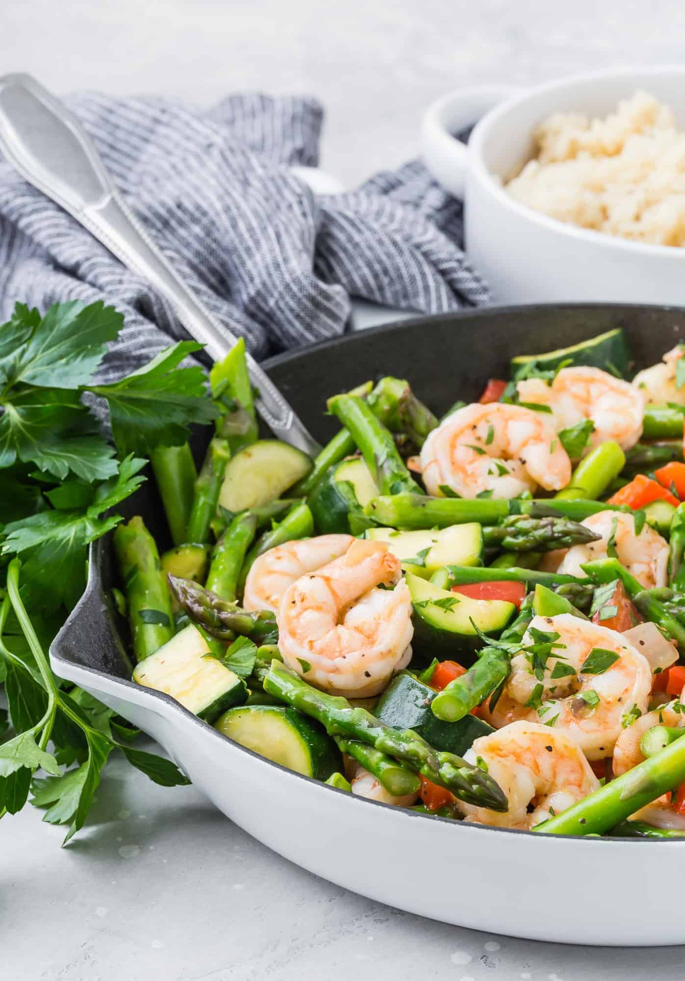 Tender pink shrimp, bright green asparagus and zucchini, crimson bell pepper, snowy white rice — doesn’t that just make your mouth water? With a hint of lemon and garlic, this lightly seasoned stir fry is perfect for warmer months.
